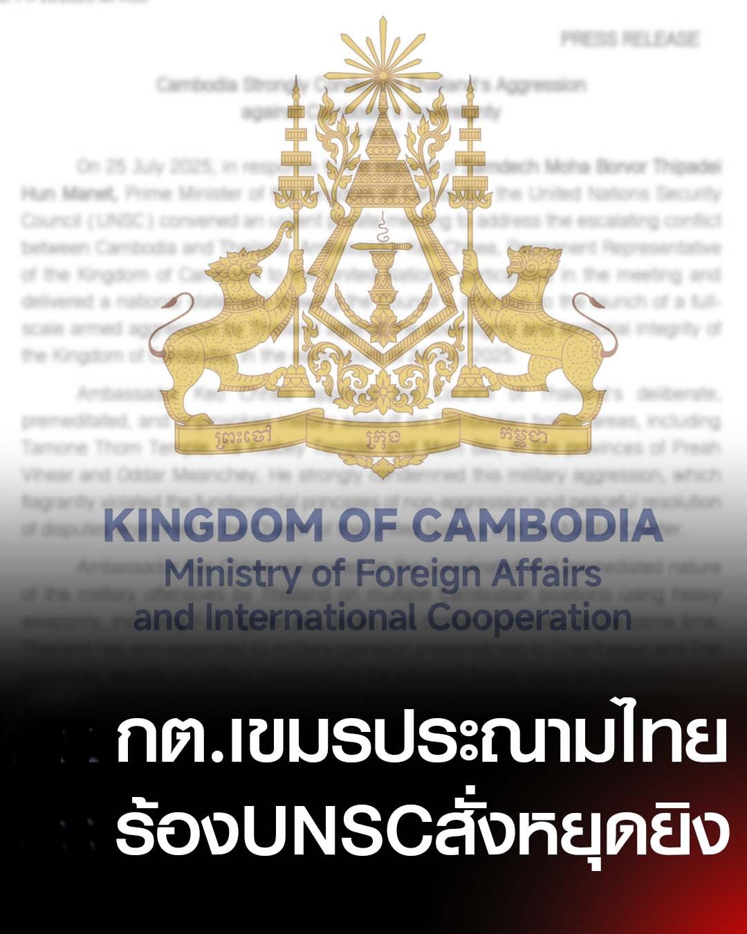 วันที่ 26 ก.ค. 2568 กระทรวงการต่างประเทศกัมพูชา ออกแถลงการณ์ประณามไทยอย่างรุนแรง หลังเกิดปะทะบริเวณชายแดน เมื่อวันที่ 24 ก.ค. อ้างว่า มีผู้เสียชีวิต 8 คน บาดเจ็บ 50 คน และประชาชนกว่า 10,000 ครอบครัวต้องอพยพ